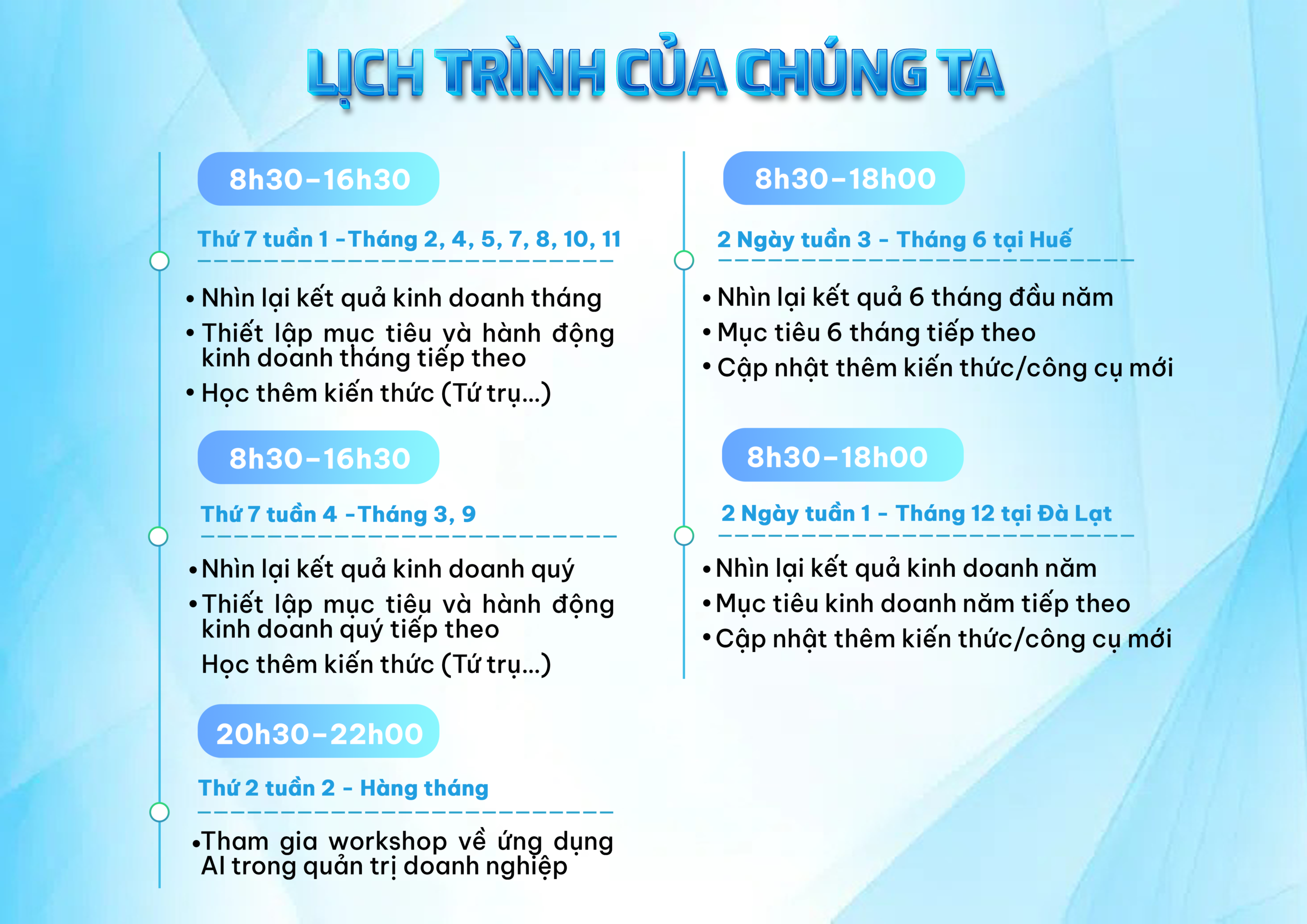 Nền tảng chiến lược & tư duy vận hành, quản trị dòng tiền & ngân sách, thiết kế và nâng cấp hệ thống bán hàng – marketing, nuôi dưỡng, phát triển đội ngũ và gắn kết theo KPI, hoàn thiện hệ thống vận hành tối giản và hiệu quả.